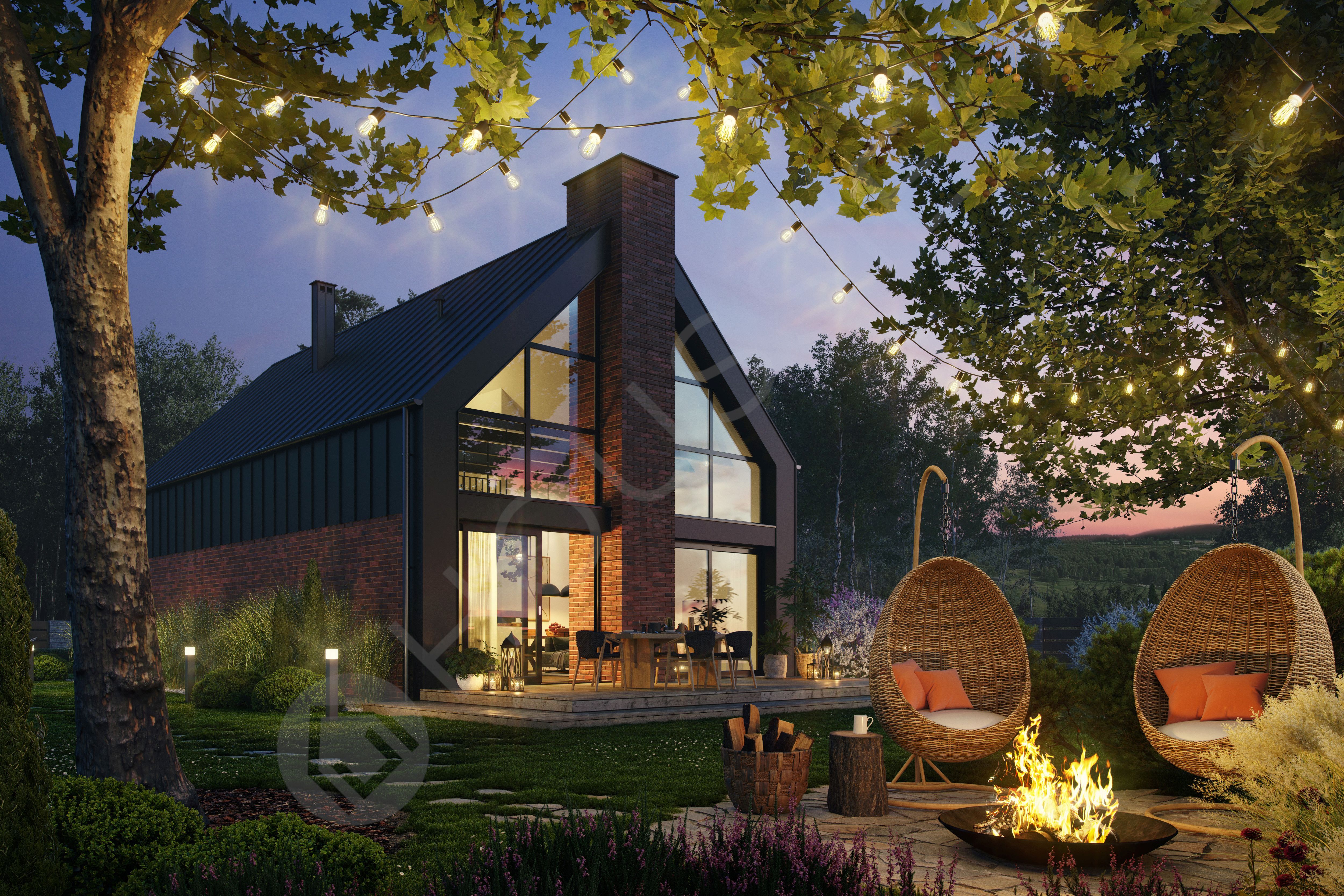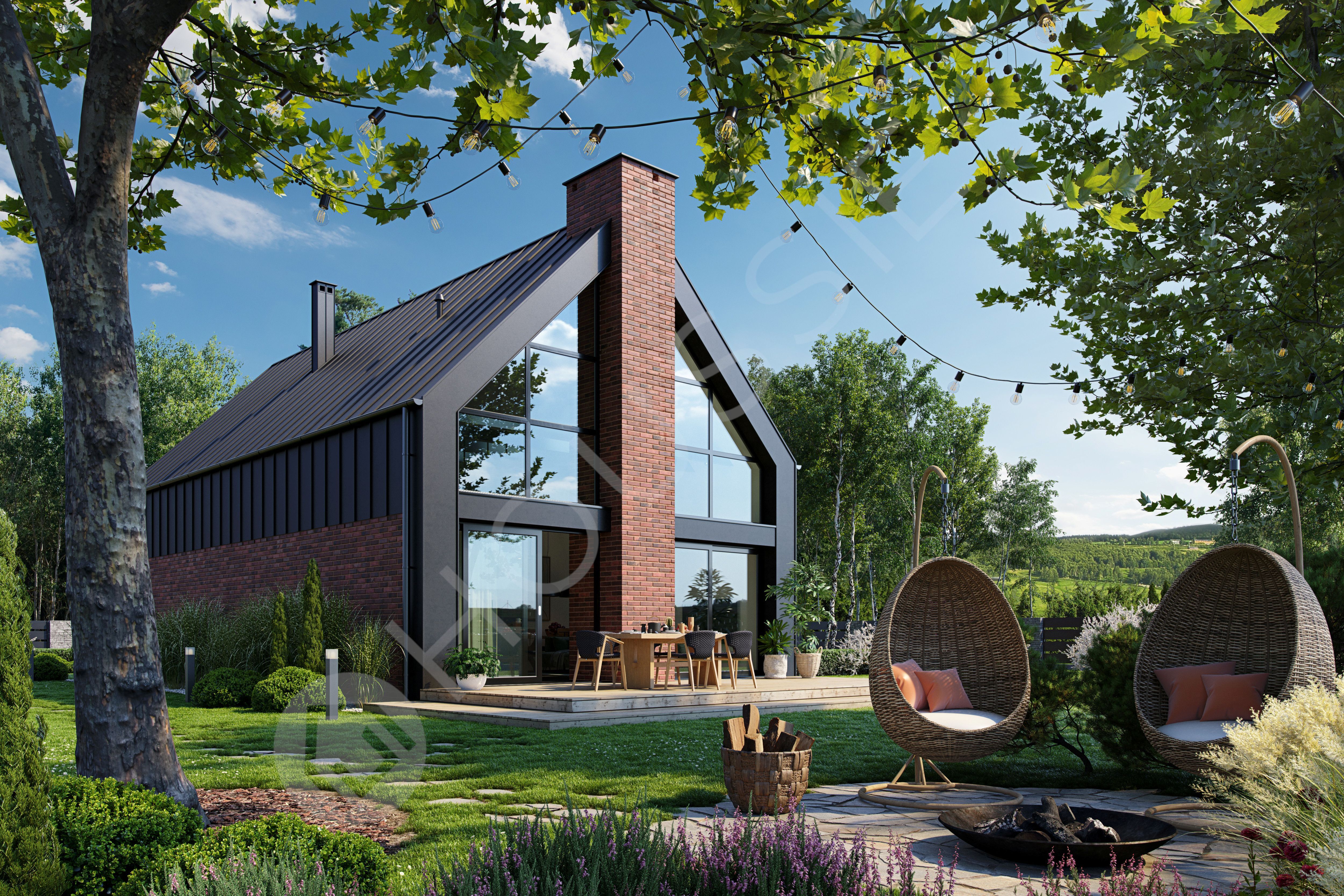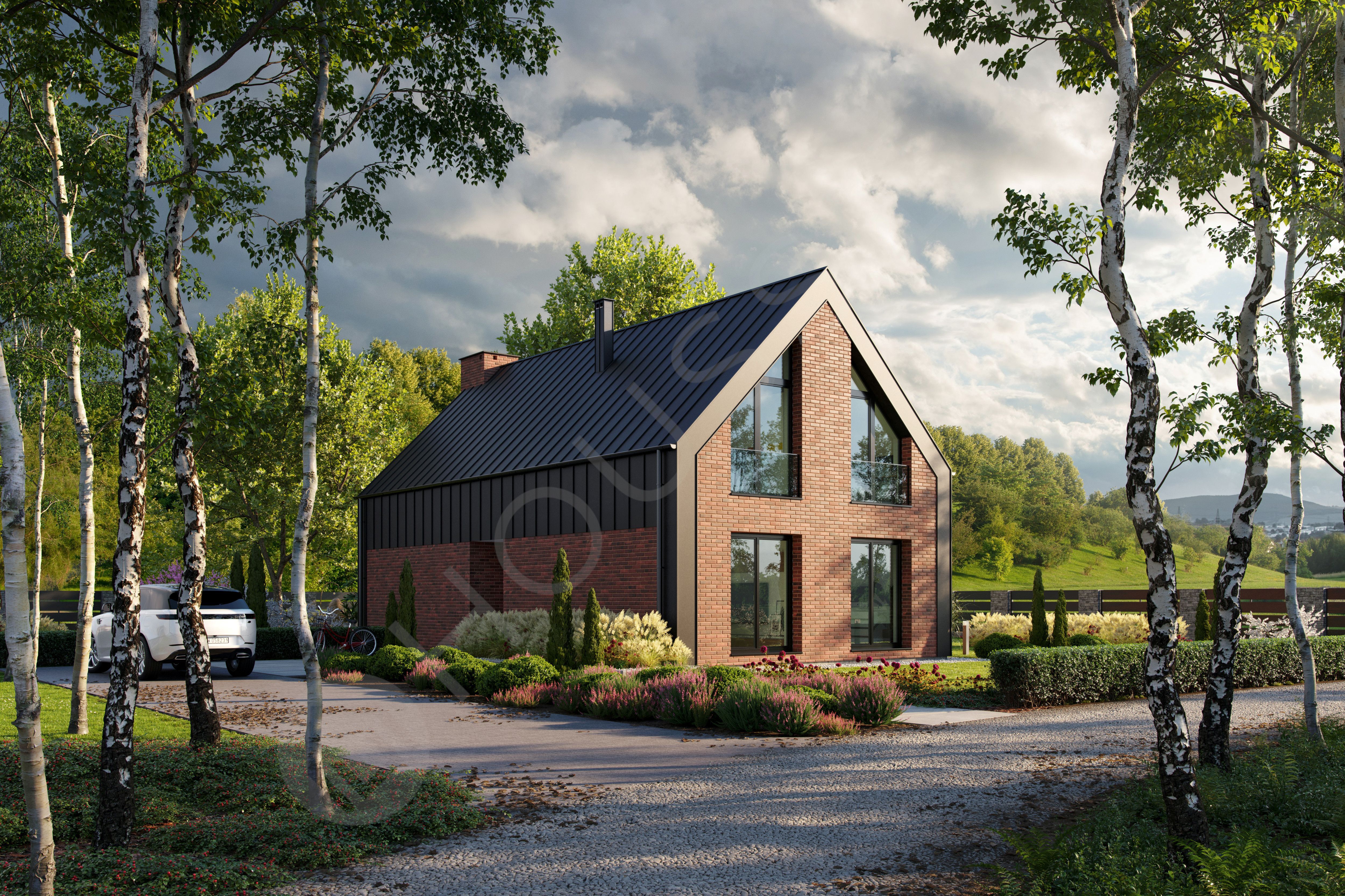 Projekt Maura 2 to zachwycająca kolejna wariacja projektu Maura, stworzona z myślą o inwestorach szukających nieszablonowej architektury i nasyconych światłem wnętrz. Bryła budynku przyciąga wzrok bezokapowym dachem płynnie przechodzącym w elewację, gdzie chłodna, antracytowa blacha na rąbek spotyka się z ponadczasowym ciepłem czerwonej cegły. Ogromne, sięgające samej połaci dachu przeszklenia w ścianie szczytowej stanowią nie tylko piękny detal zewnętrzny, ale przede wszystkim zapraszają do środka otaczającą naturę i maksymalnie doświetlają przestrzeń.