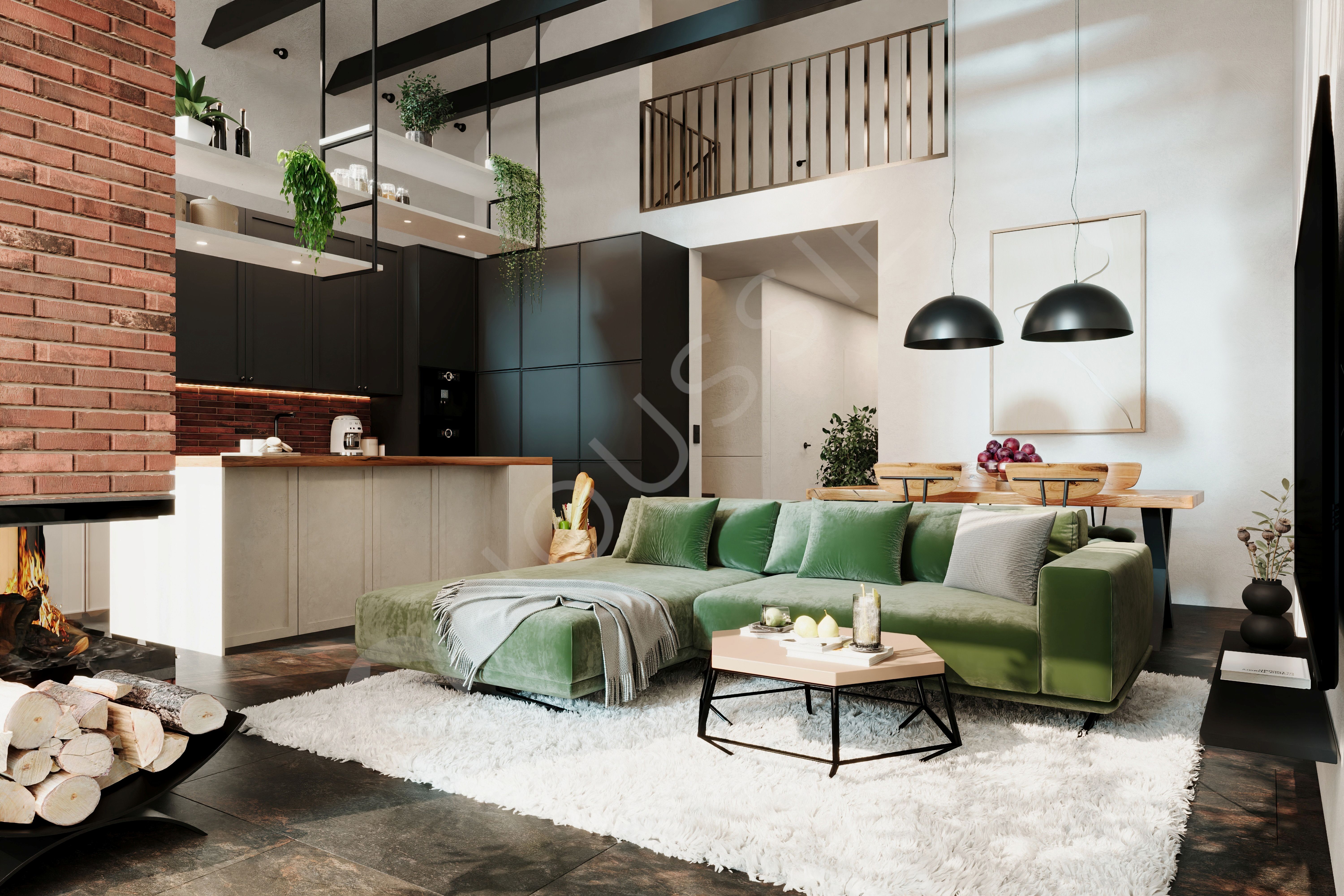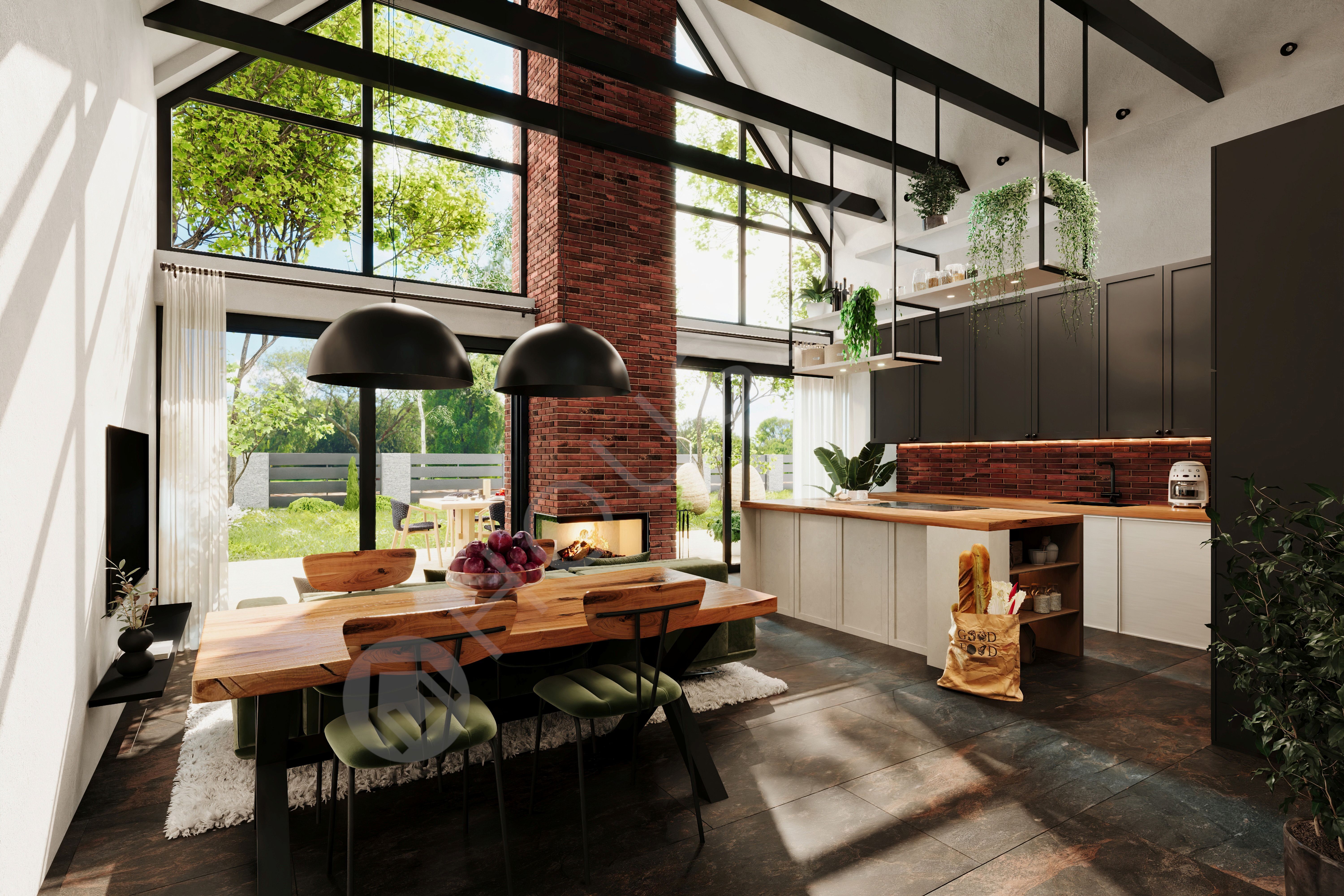 Prawdziwe serce tego domu bije w spektakularnej strefie dziennej, gdzie zrezygnowano ze stropu na rzecz otwarcia przestrzeni aż po sam dach. Ten zabieg, w połączeniu z wyeksponowanymi czarnymi belkami konstrukcyjnymi oraz strzelistym, ceglanym kominem, nadaje wnętrzu unikalny, lekko loftowy charakter. Centralnie ulokowana kuchnia z dużą wyspą roboczą naturalnie łączy się z jadalnią i przestronnym salonem, tworząc idealne miejsce do celebrowania wspólnego czasu.